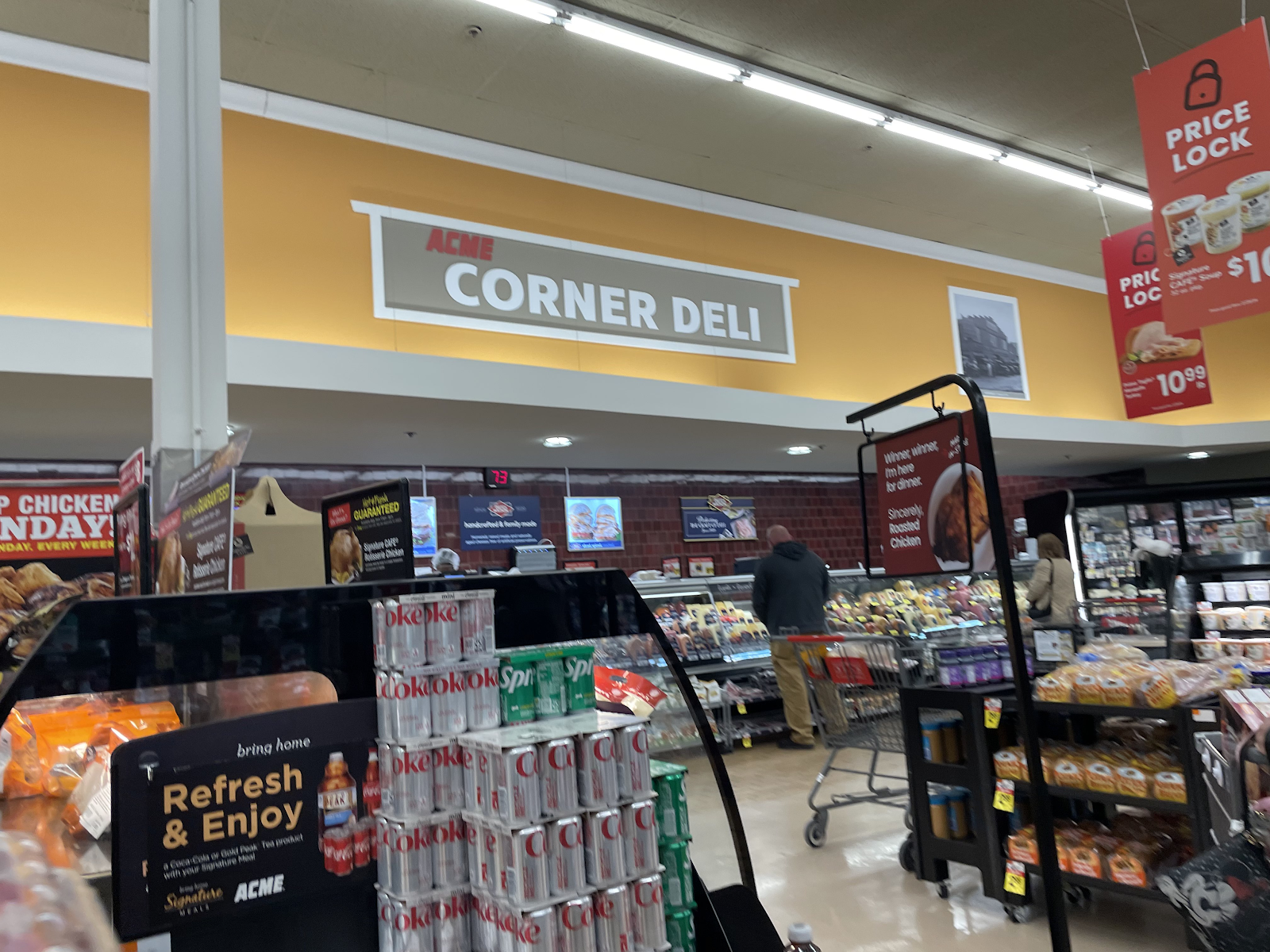 The ShopRite Kitchen and the deli are in an island on the left side of the grand aisle. The health and beauty department is on the opposite side of the island.
